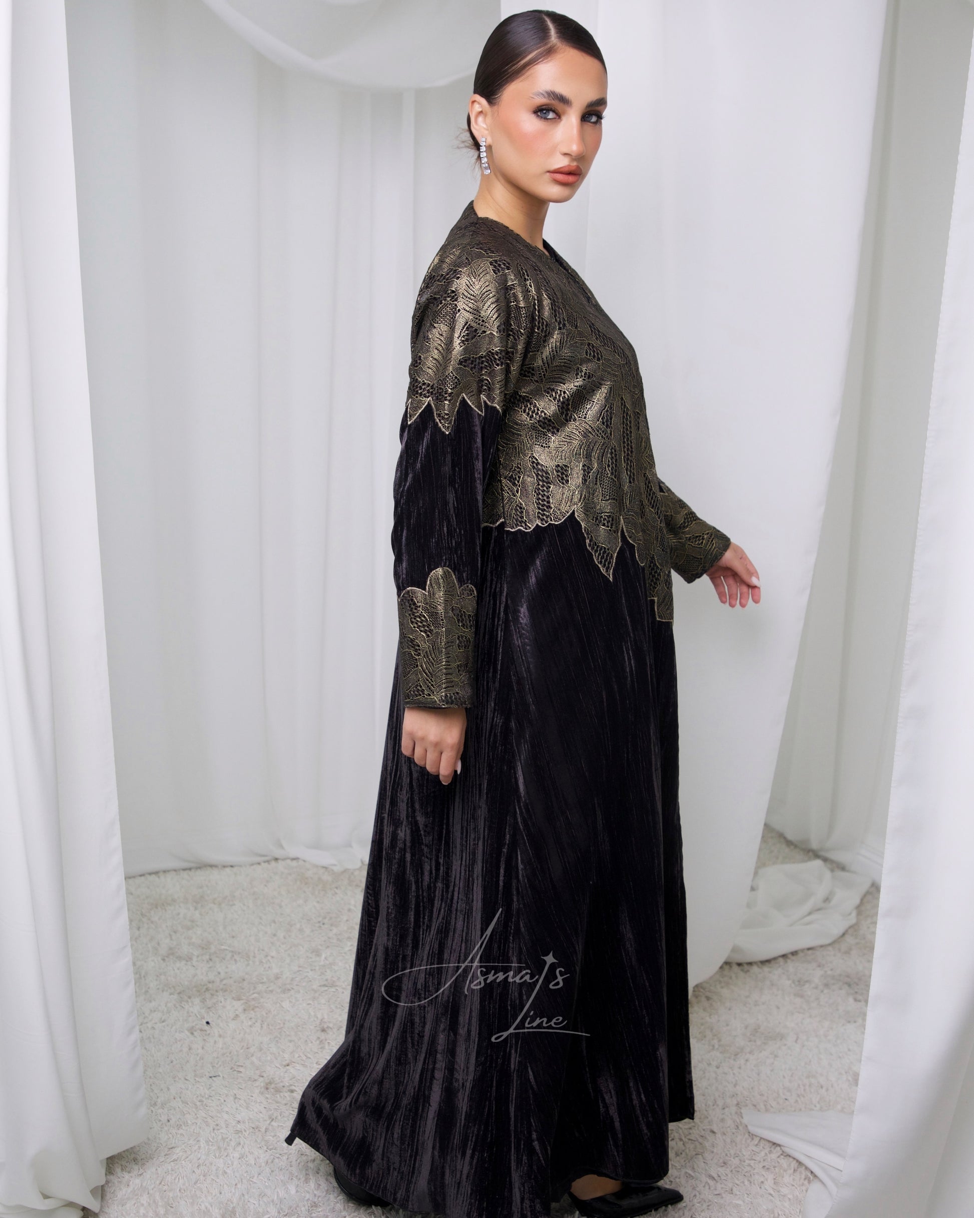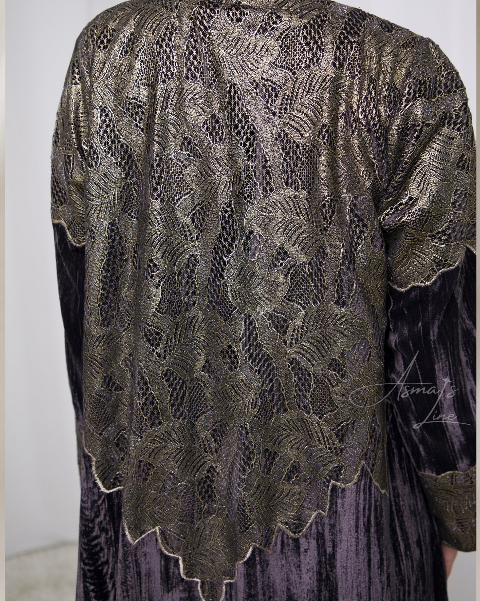 A refined statement abaya where gold lace meets fluid purple velvet elegance, crafted for moments that call for distinction!